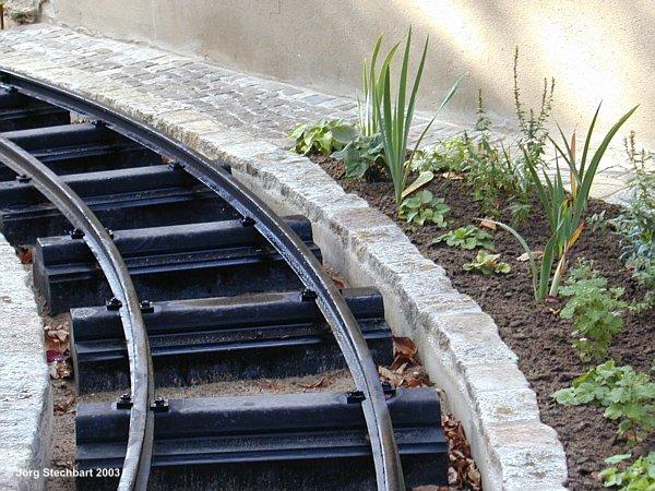 ![]() ...und die Achsen der Ns1. | ![]() Der im Sommer 2003 fertig gestellte Gleisbogen mit Granitsteineinfassung - einfach nobel! |