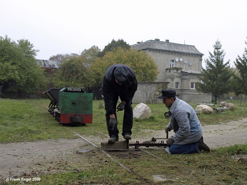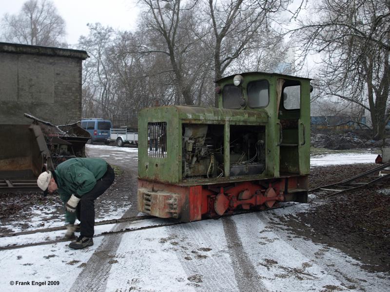 ![]() Freischnitt des Gleises zum Lokschuppen II. Links eine Kastenlore aus Zeesen. | ![]() Die aus dem Schuppen II geborgene Ns2f LKM 248908 (ex. 485 mm!) am Überweg nahe dem Lokschuppen I. |